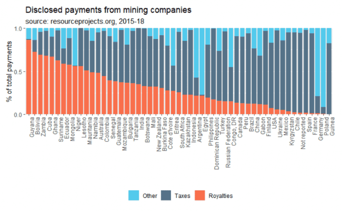 In the meantime, developing countries face enduring challenges in taxing mining companies. Most countries’ fiscal regimes for mining include a mix of production-based taxes, typically royalties or export taxes, and profit-based taxes. To create the figure below, we pulled data on payments to governments from resourceprojects.org, disclosed by mining companies listed in the European Union or Canada over the last three years, showing what proportion of these payments were royalties, taxes (mostly corporate income taxes), or other types of payments. Although the data do not represent all revenue from mining in these jurisdictions, they do show a wide range of tax collection realities. For some countries on the left side of the figure, royalties represent more than half of all payments declared by mining companies, reflecting governments’ difficulties in collecting income tax, which are typically easier for corporate taxpayers to avoid. Both tax and royalties depend on a proper assessment of production quantity, quality and value, but income taxes can also be minimized through the mispricing of costs.