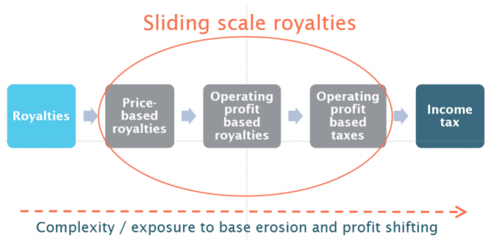 - Price-based royalties, which are production-based royalties with rates varying according to mineral prices. Examples: Côte d’Ivoire, Bolivia.