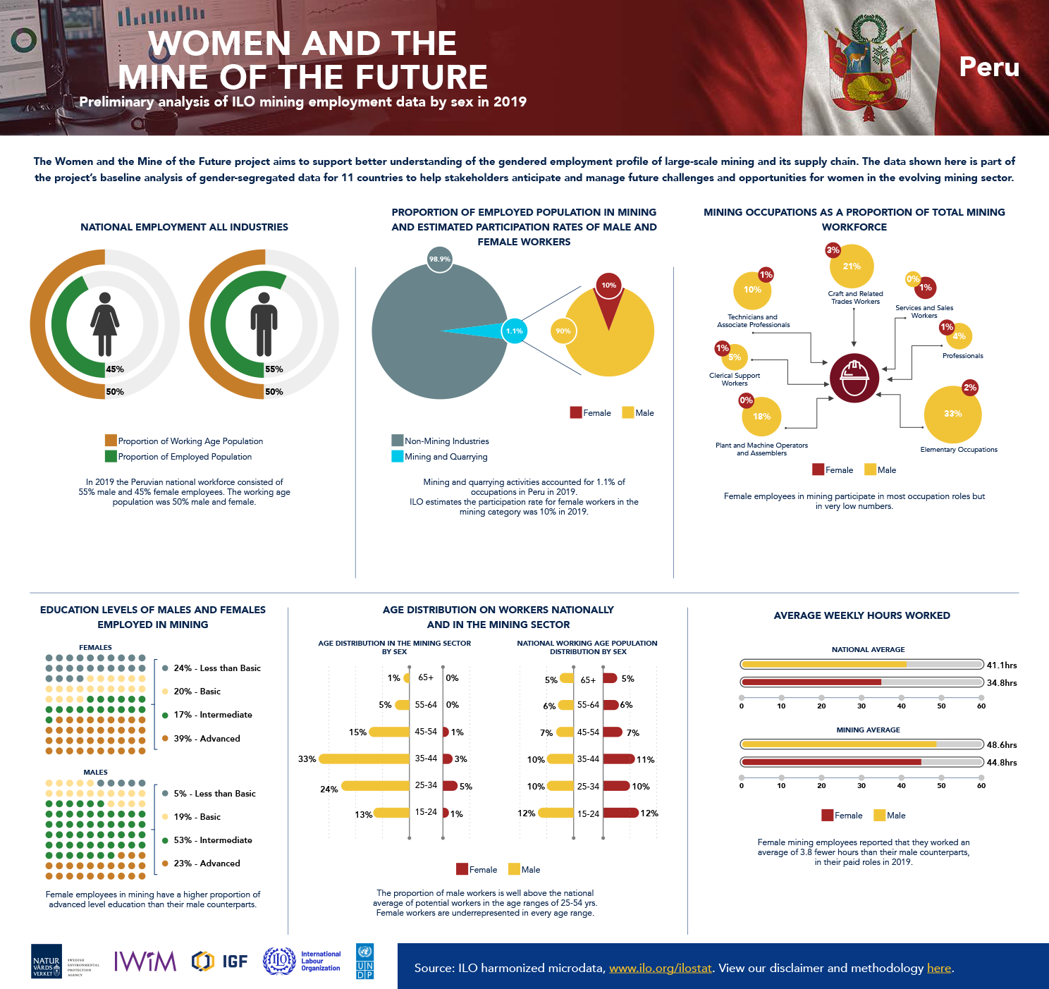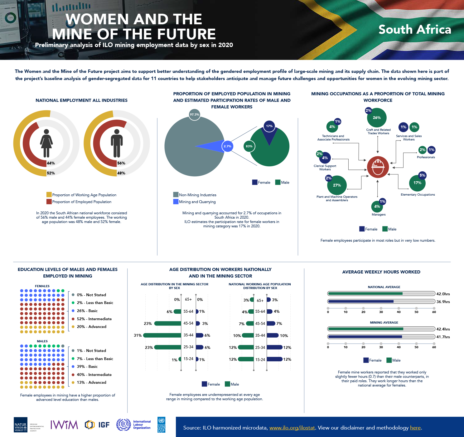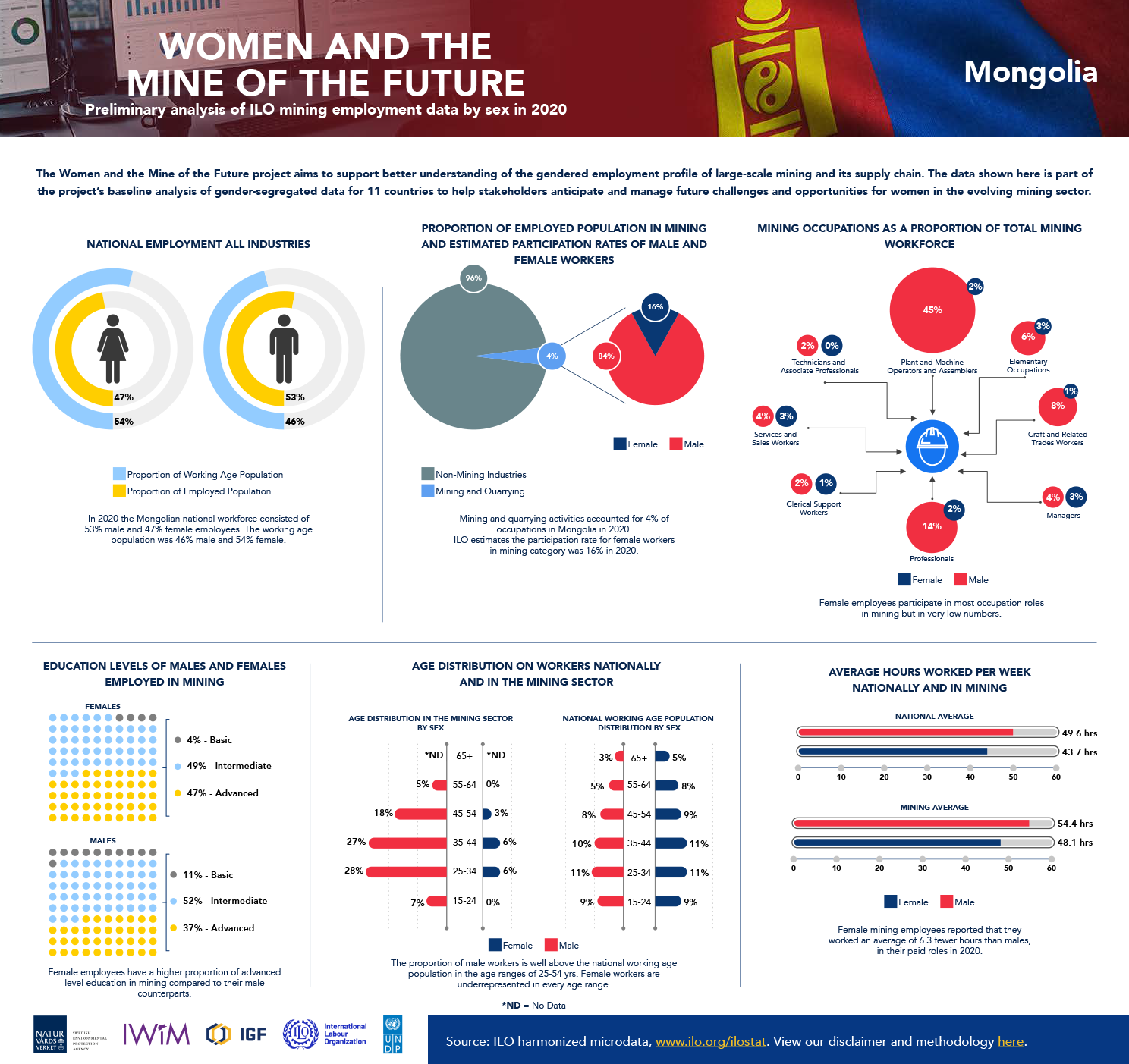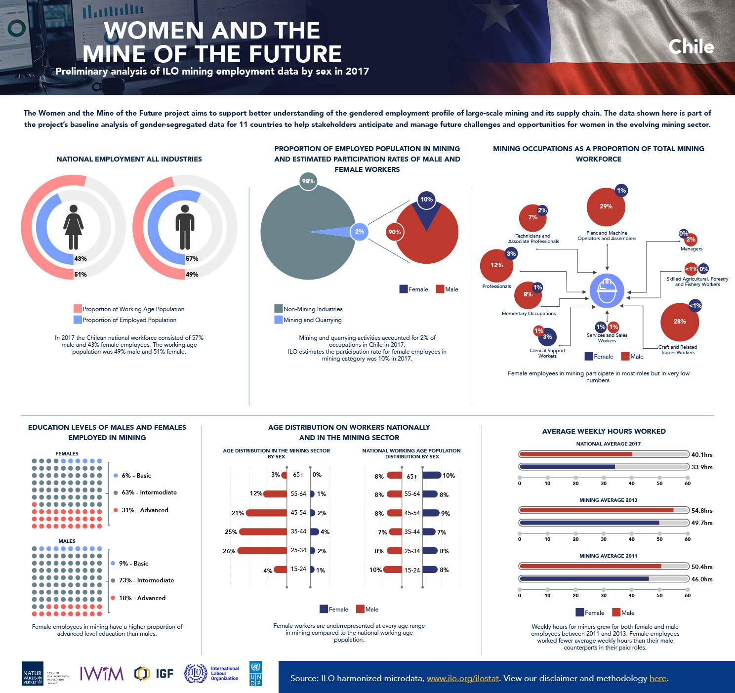 The following infographics reflect the baseline data analysis of gender-segregated data included in the global report, including 10 country-specific infographics intended to provide greater understanding of the gendered employment profile of large-scale mining. The data is drawn from household surveys, such as national labour force surveys, which the ILO has collected, processed, and harmonized for country-to-country comparison.