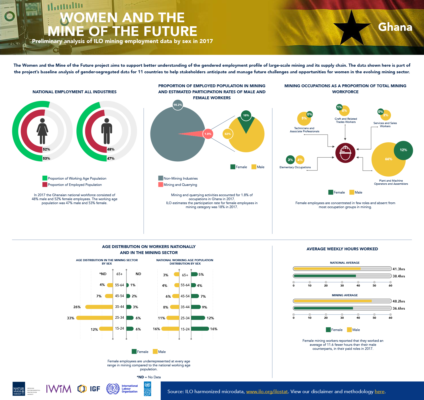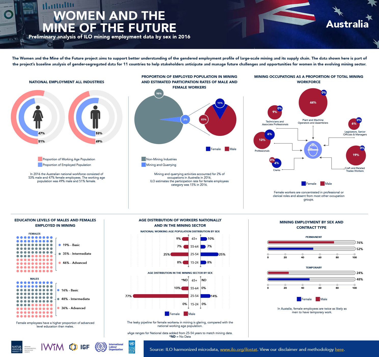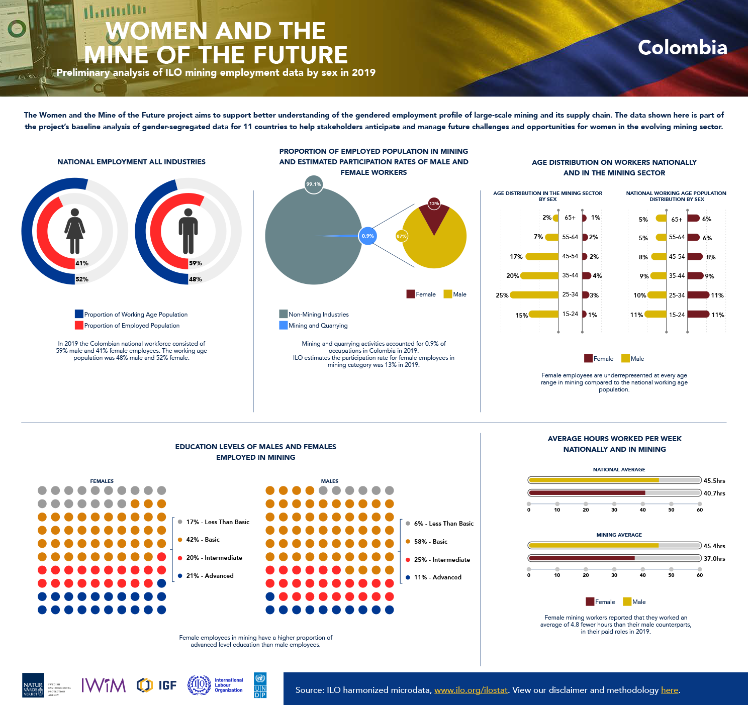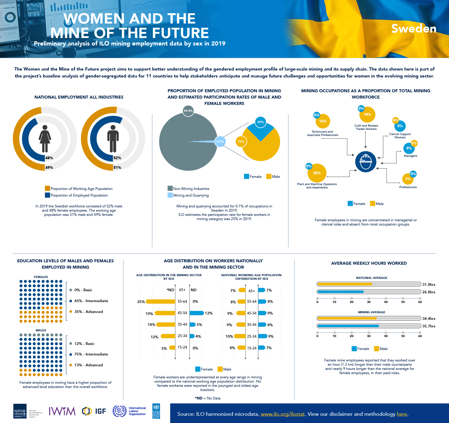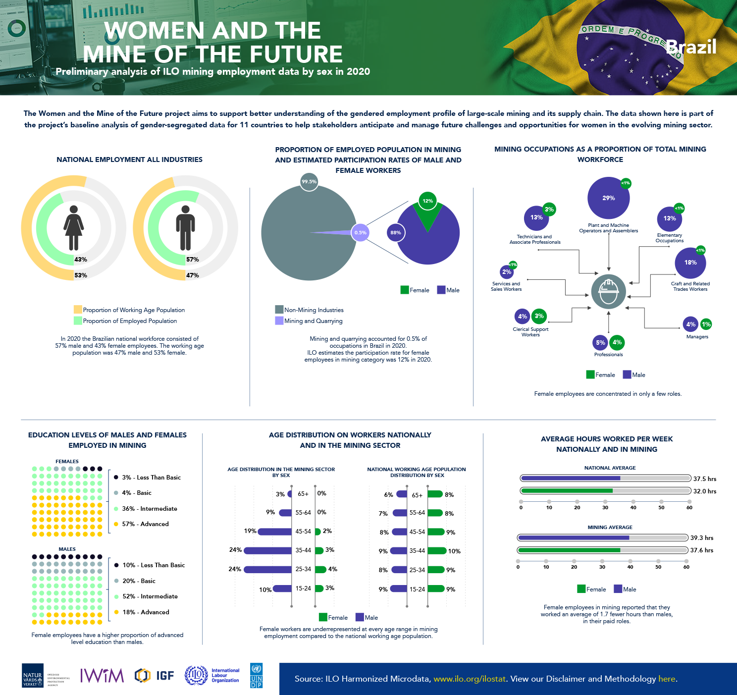 The following infographics reflect the baseline data analysis of gender-segregated data included in the global report, including 10 country-specific infographics intended to provide greater understanding of the gendered employment profile of large-scale mining. The data is drawn from household surveys, such as national labour force surveys, which the ILO has collected, processed, and harmonized for country-to-country comparison.
