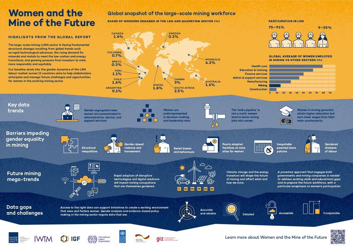 To help address widespread data and knowledge gaps, the Women and the Mine of the Future: Global Report uncovers the gender-disaggregated employment profile for large-scale mining in 12 nations, focusing on women and their occupations in the sector.