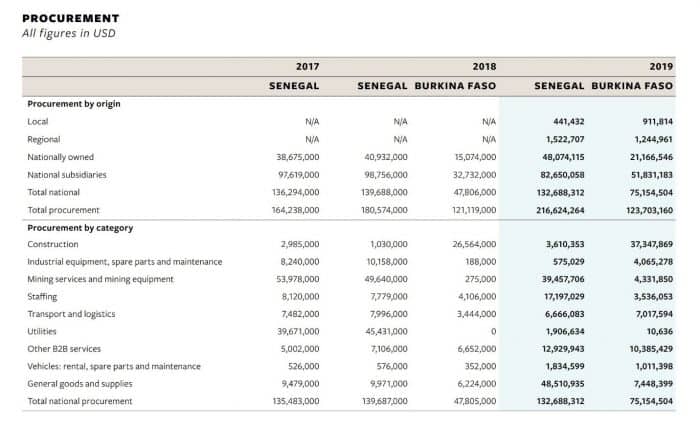 Figure 1. Teranga Gold, who uses the LPRM, provides a detailed breakdown of how much spending goes to different types of suppliers for broad categories of goods and services