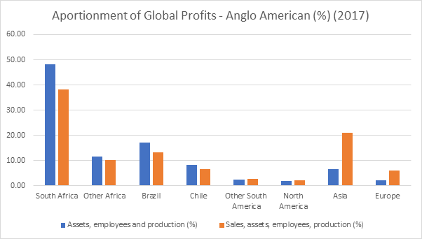 Taking Anglo American as an example, if sales were added as a basis for allocating profit (see orange bar below), the share of global profit would fall in the resource-owning countries (e.g., South Africa, Brazil, Chile) and increase in the market countries (e.g., Asia [primarily China] and Europe).